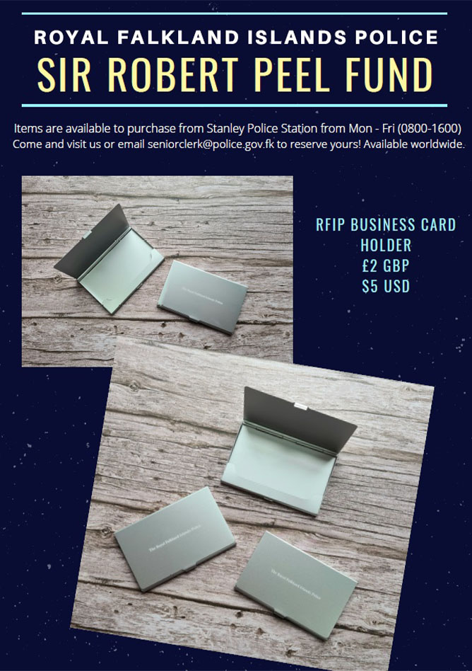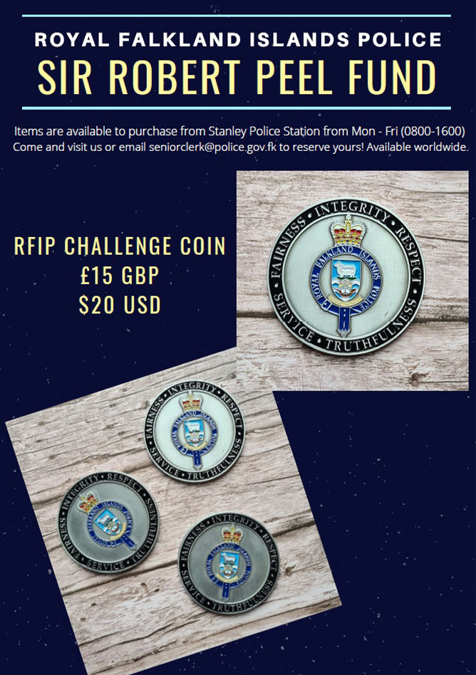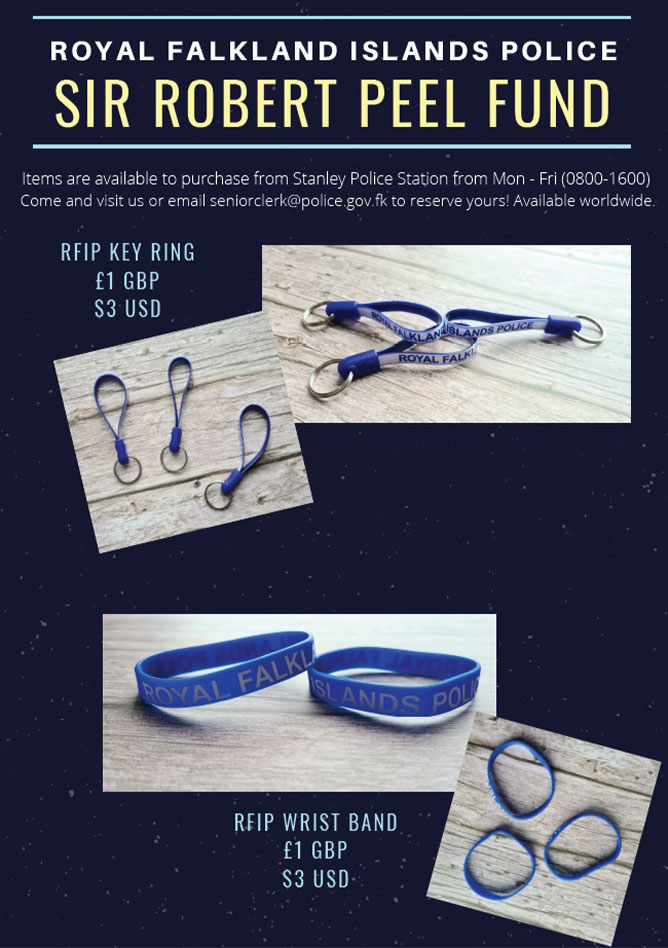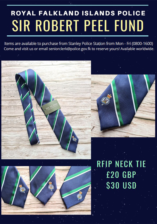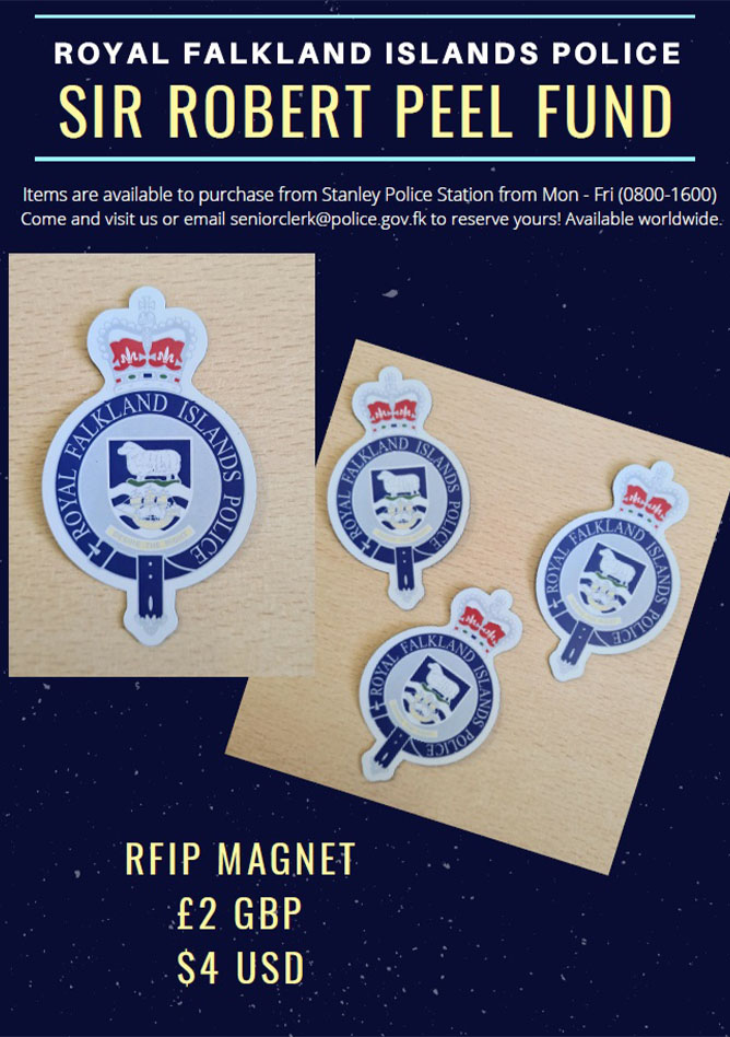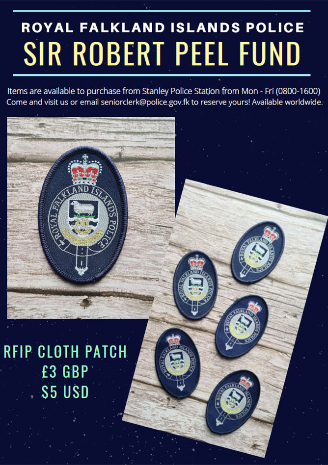 Items in support of the Sir Robert Peel Fund are available to purchase from Stanley Police Station, Monday to Friday (0800 – 1600).